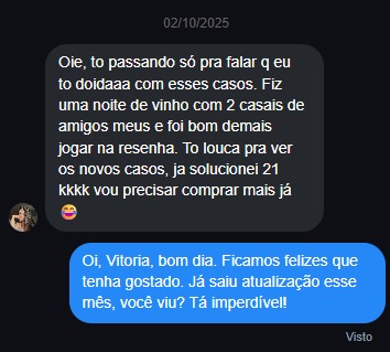 Você recebe mais de 100 casos misteriosos para resolver com seu parceiro(a), família ou amigos. Cada caso apresenta pistas, armadilhas e reviravoltas — e o desafio é descobrir a verdade juntos.